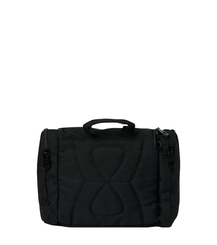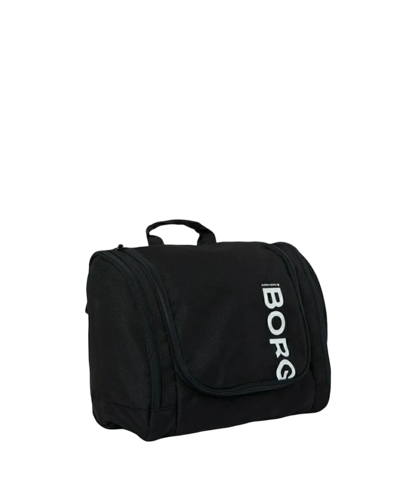 Björn Borgin musta toilettilaukku jossa on kolme taskua, joista keskimmäinen on suurin. Keskimmäisestä taskusta löytyy lisäksi myös koukku ja yksi vetoketjullinen tasku ja kuminauhaa, joiden avulla purkit pysyvät pystyssä. Toilettilaukussa on myös pieni kantokahva.