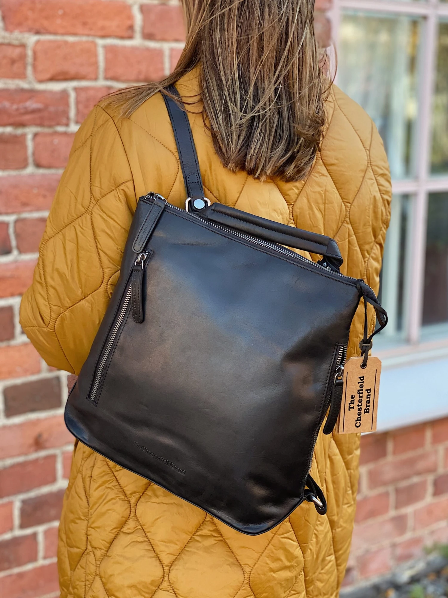 Chesterfield Elise on pelkistetty ja kaunis pieni nahkareppu. Laukun käytännöllisyyttä lisää se, että sen saa myös olkalaukuksi. Laukun sisällä on pieni vetoketjutasku ja pari avotaskua. Sen etupuolella on kaksi vetoketjulla suljettavaa pientä taskua. Myös takana ulkopuolella on pieni vetoketjutasku.