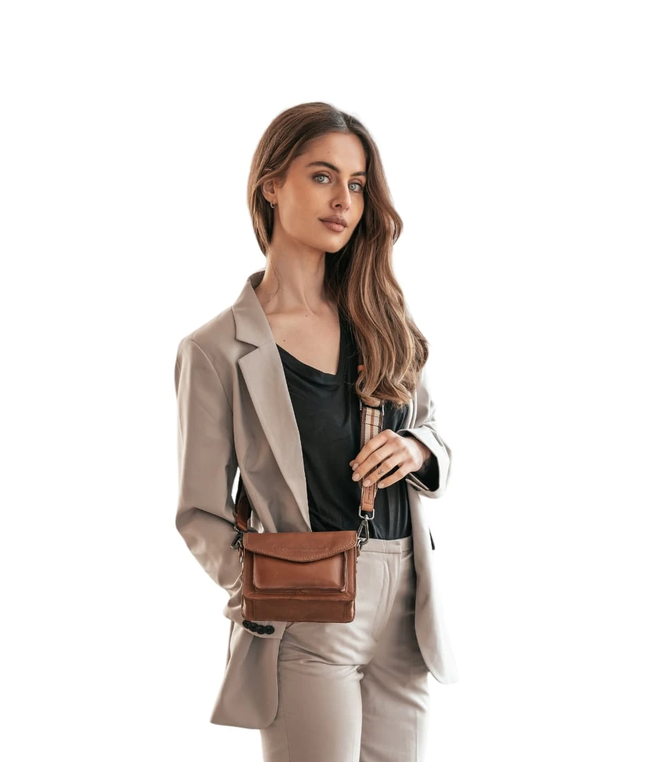 Hihna sopii parhaiten ruskean laukun kanssa, koska siinä on ruskeat nahkaiset yksityiskohdat.