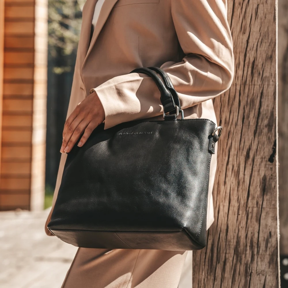 Mukana tulee pitkä säädettävä ja irrotettava olkahihna jonka avulla saa laukun tarvittaessa olalle. Lyhyet kahvat laskeutuvat nätisti laukun sivuille.