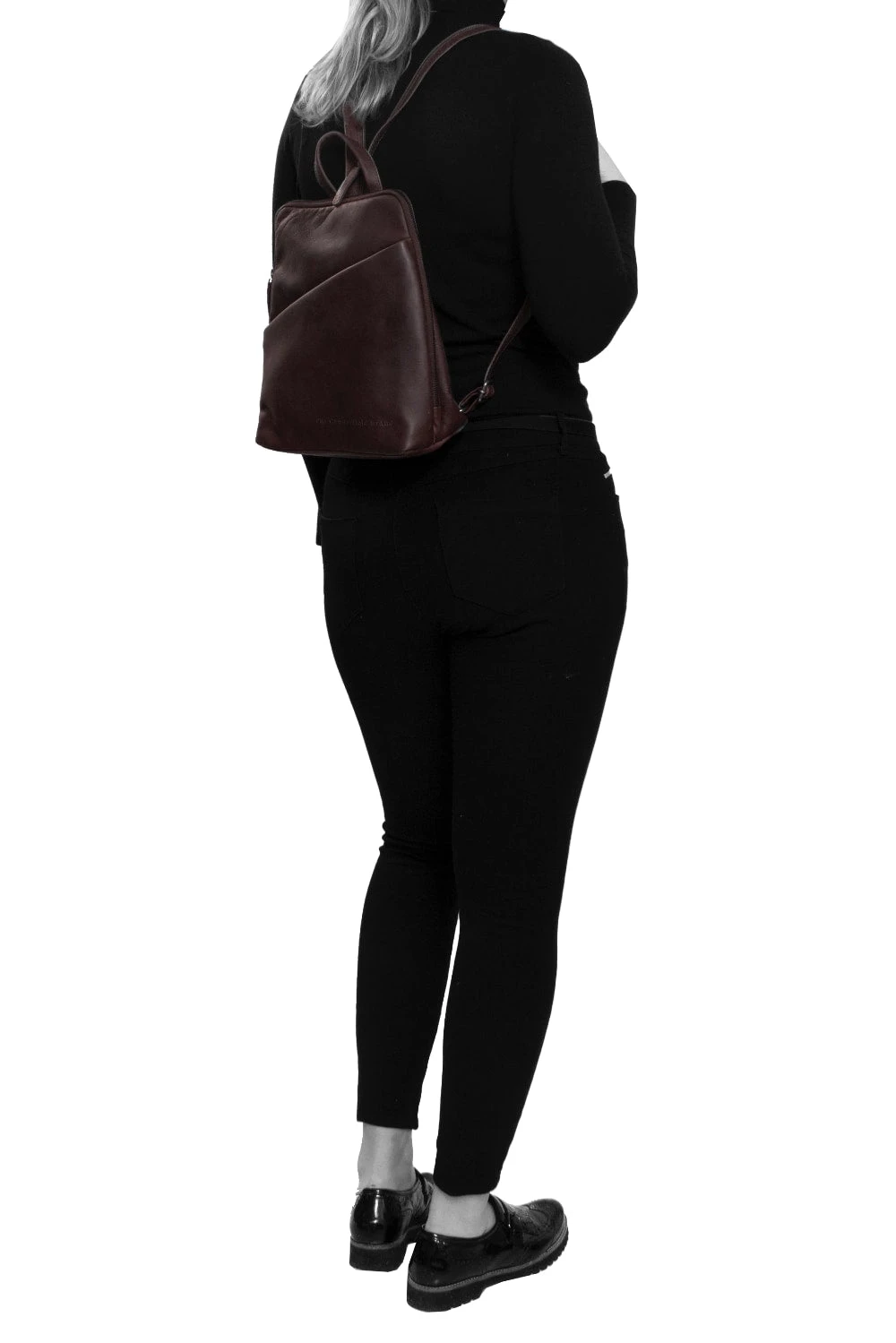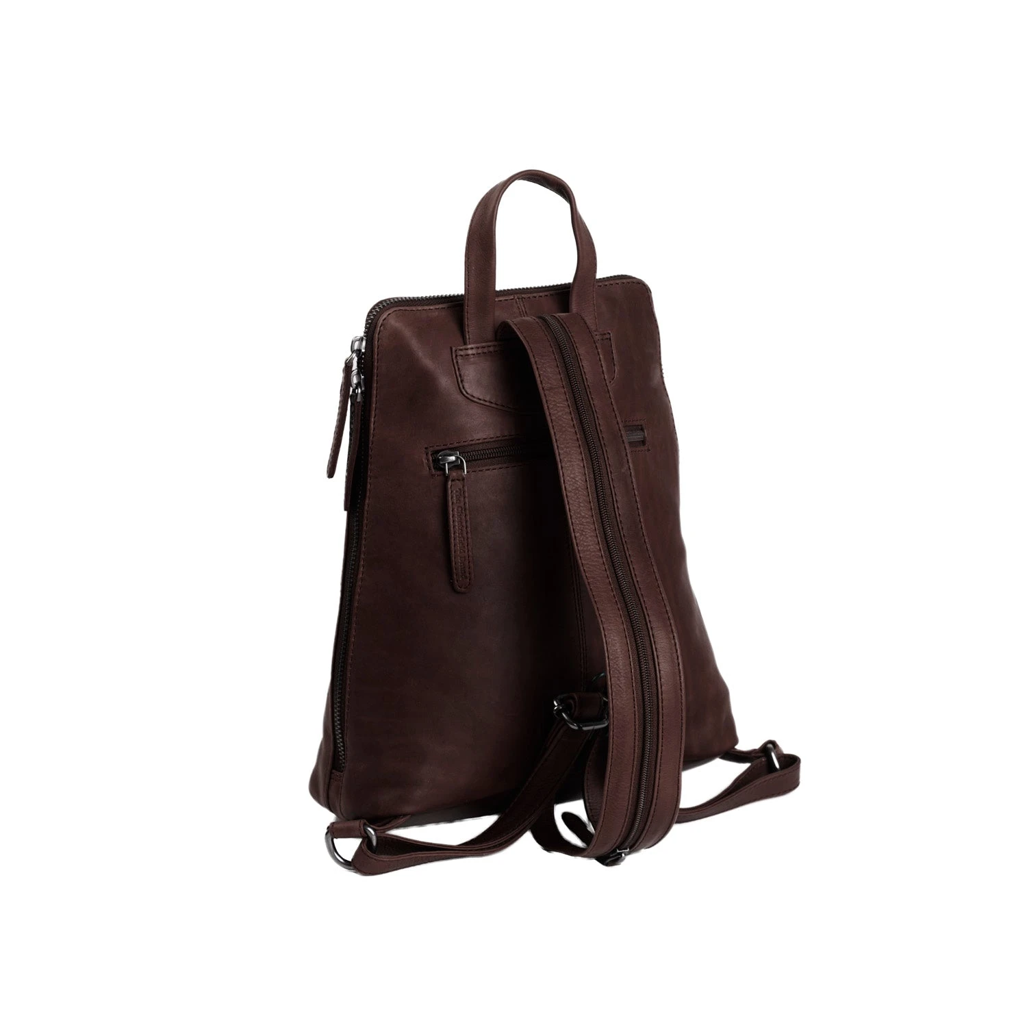 Tyylikäs nahkareppu toimii mainiosti käsilaukkuna. Sisällä tasku joka jakaa sisätilan kahteen osaan, puhelintasku ja korttipaikkoja. Reppu avautuu kunnolla, joten sieltä löytää tavarat helposti. Ulkopuolella on takana ja edessä vetoketjutasku. Hihnan keskellä vetoketju, joten reppua voi kantaa myös olalla.