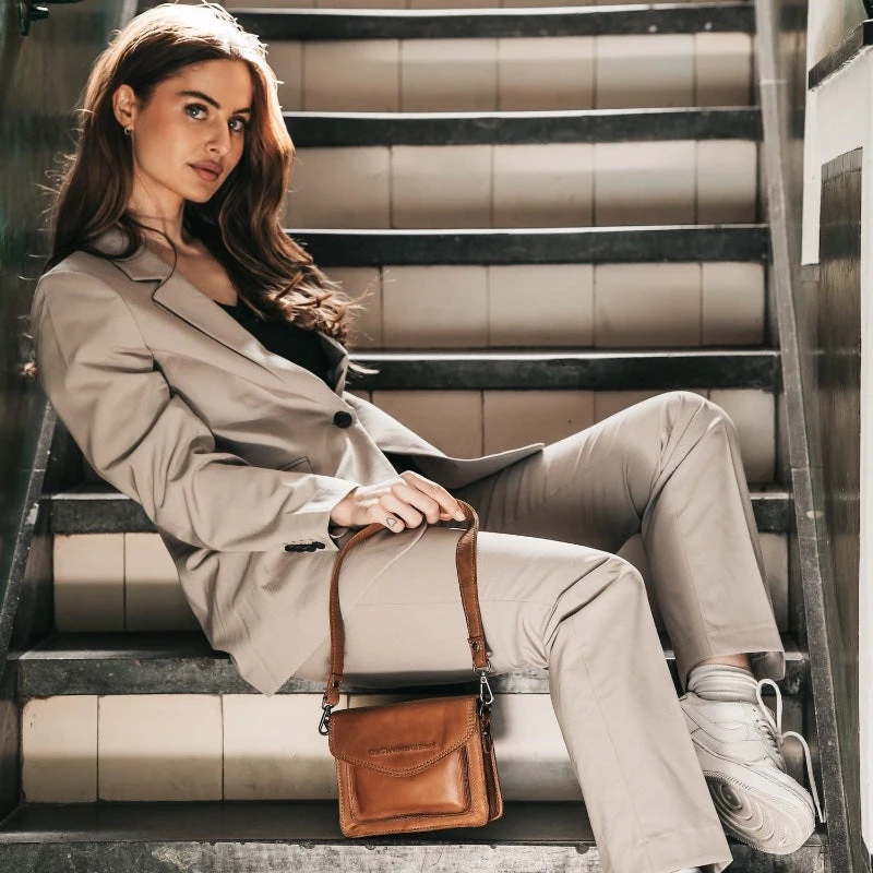 Tyylikäs yksinkertainen nahkalaukku on niin napakka, että se pysyy muodossaan tyhjänäkin. Laukussa on yksi osio jossa on vetoketjulla suljettava tasku ja avotasku puhelimelle. Lisäksi laukun edessä on avotasku ja laukun takana vetoketjutasku.