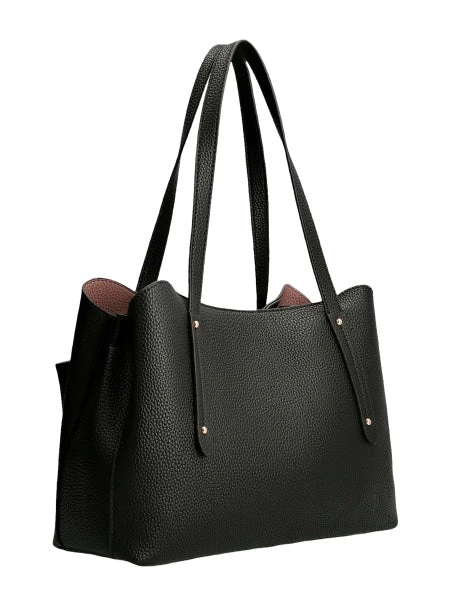 Laukku on jaettu 2 osaan, jossa tilanjakajana toimii tilava vetoketjullinen tasku. Ensimmäisestä osiosta löydät tilavan avotaskun ja toisesta osiosta yhden vetoketjullisen taskun. Laukun sisus on monivärinen jossa yhdistyvät violetti ja musta. Mukana on myös irroitettava pieni pussukka jossa saa kuljetettua esimerkiksi avaimet ja huulipunat, tai puhelimen.