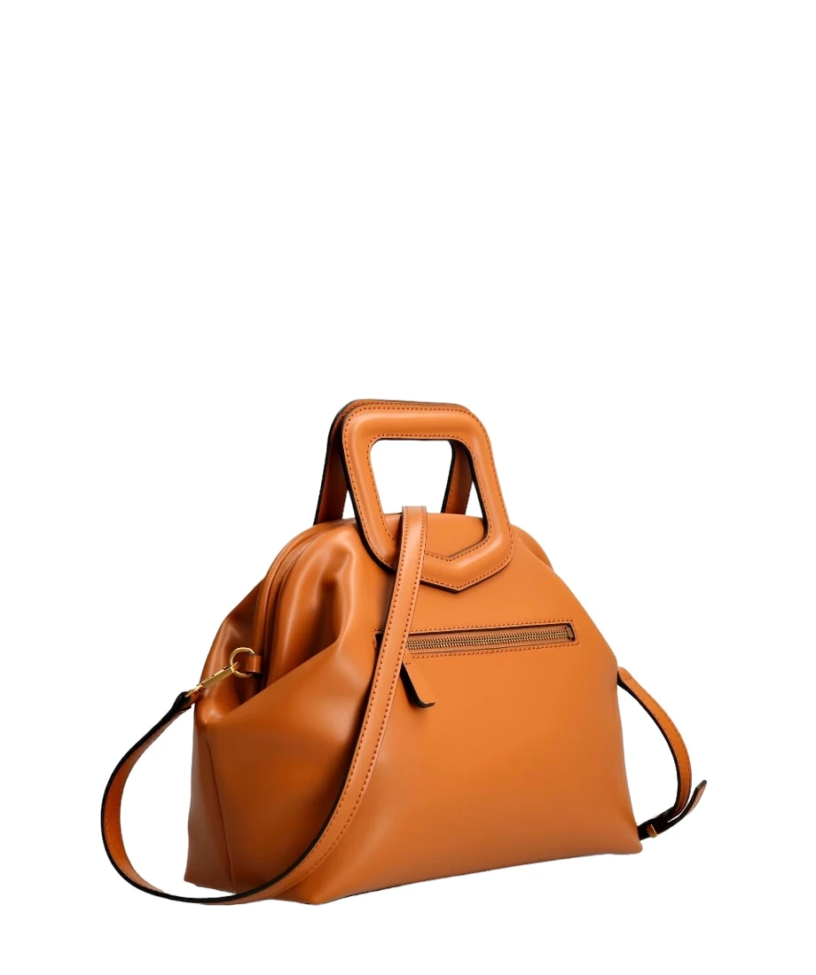 Laukku sulkeutuu nahkan alle piillotetuilla magneetiisilla neppareilla. Laukun sisällä on upea logokuvioitu vaalea kangas, 2 avotaskua sekä yksi vetoketjutasku. Laukun takaa löytyy lisäksi vetoketjutasku.