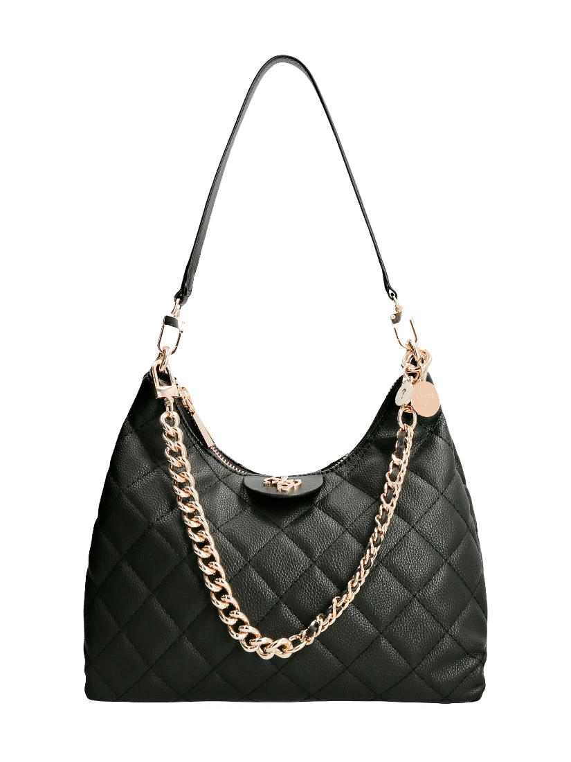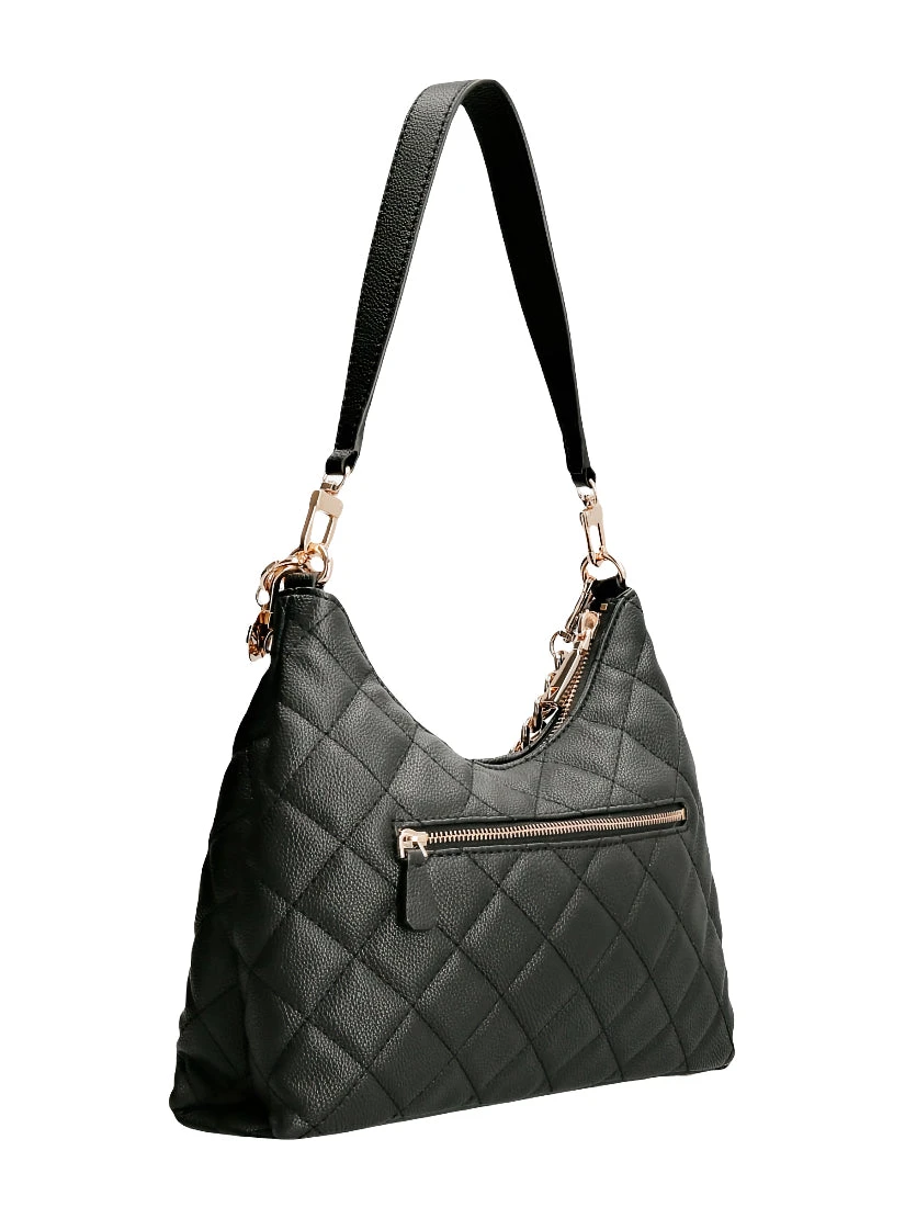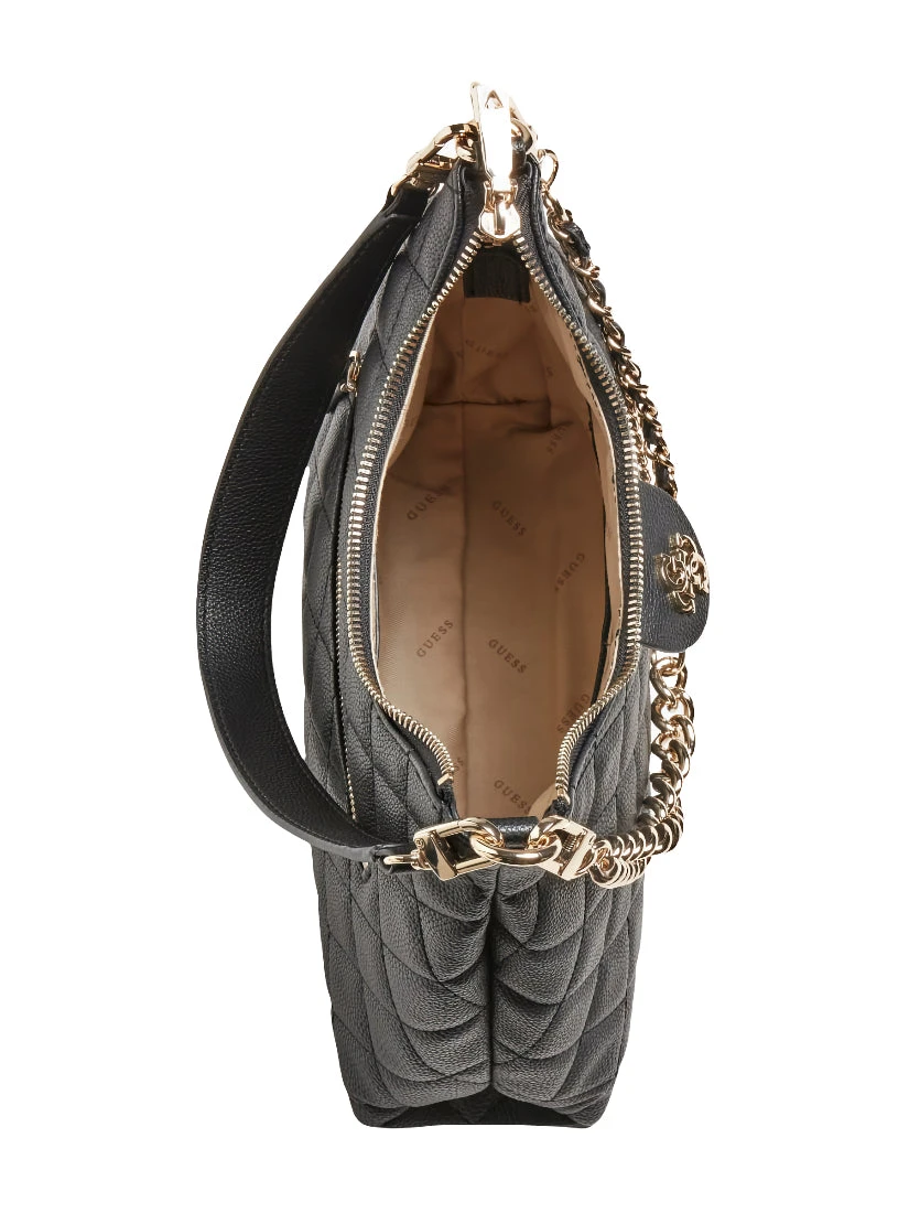Metalliketjulla koristellut laukut ovat nyt todella suosittuja. Ja tässä Guessin Gillian laukussa ketjun saa myös irroitettua, jolloin laukku on yksinkertaisempi mutta edelleen todella kaunis. Laukun sisällä on vetoketjutasku ja muutama avotasku. Lisäksi laukun takana on vetoketjullinen tasku. Laukun saa helposti olalle. Sekä olkahihna että ketju ovat irroitettavissa. Ja voit käyttää ketjua myös olkahihnana. Laukussa ei ole pitkää olkahihnaa.