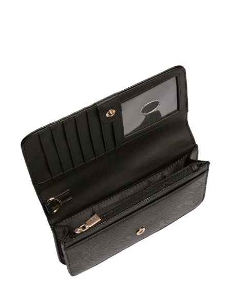 Guess Laurel lompakossa on kaunis musta väri. Lompakko aukeaa läpällä, jossa on kiinnityksenä neppari. Lompakon sisältä löytyy muutama avotasku ja vetoketjullinen tasku käteiselle, sekä 10 korttipaikkaa, joista yksi on läpinäkyvä. Lompakon takana on tilava tasku puhelimelle, jossa kiinnityksenä neppari. Lompakossa on myös rannehihna jonka saa halutessaan irti.