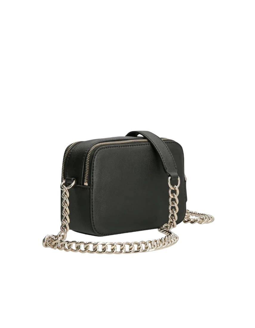 Laukussa on kultainen ketjuhihna, jossa on olkapään kohdalla musta jäljitelmänahkainen vahvike.