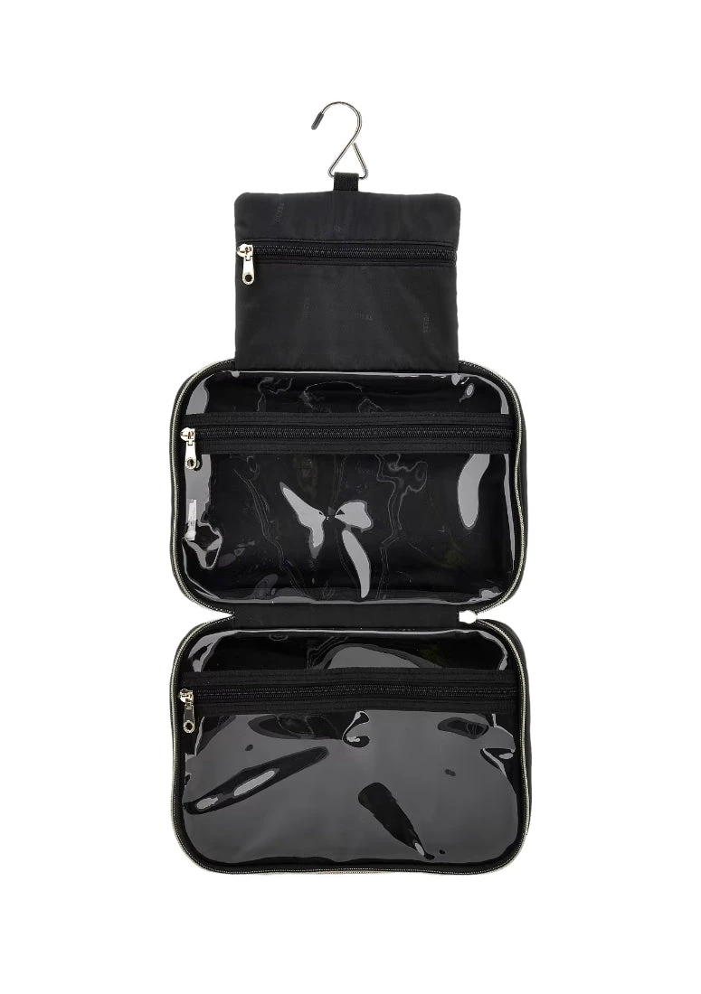 Toilettilaukku aukeaa vetoketjulla ja sisältä löytyy 2 tilavaa vetoketjutaskua joiden sisään näkee. Lisäksi toilettilaukussa on pieni vetoketjutasku jonka yllä on koukku mistä toilettilaukun saa ripustettua kiinni kylpyhuoneeseen. Toilettilaukussa on myös pienet kahvat jolla sitä voi halutessaan myös kantaa.