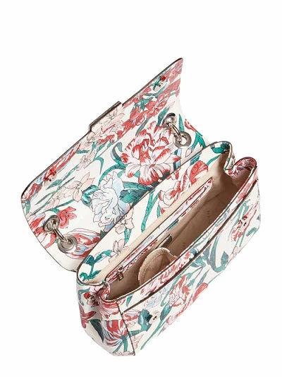 Upea Guessin kukkakuvioinen laukku viimeistelee kesätyylisi! Laukussa on kaksi olkahihnaa: lyhyemmässä on vähän hopeanväristä ketjua koristeena ja pitempi säädettävä ja irroitettava hihna. Laukun läpän alta löytyy tilava vaalea sisusta jossa on avotaskuja ja vetoketjutasku. Laukun sivussa on nepparit ja ne avaamalla laukku avautuu vielä isommasti. Laukun takana on vetoketjutasku.