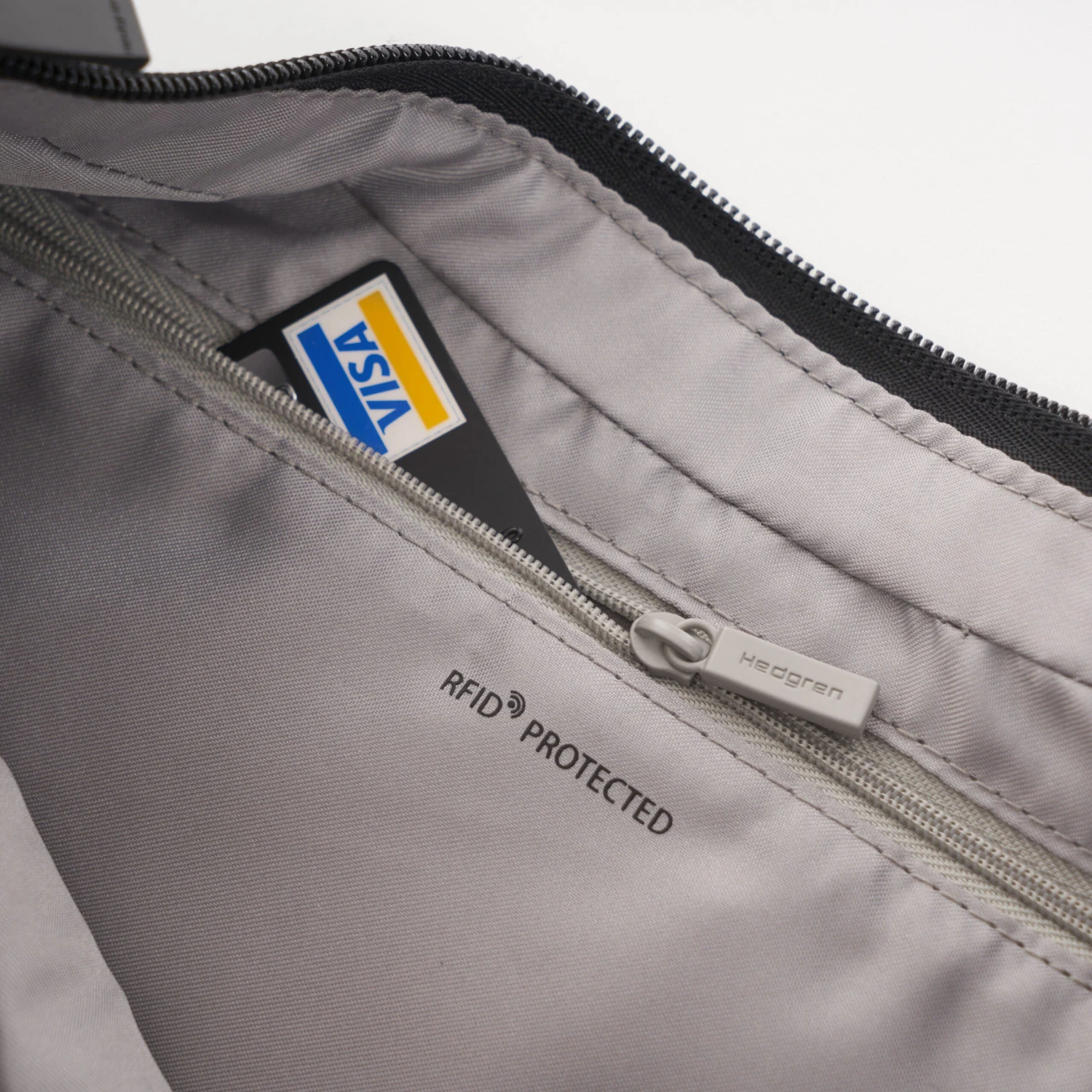 Hedgrenin tilava ja monikäyttöinen laukku on todellinen arjen pelastaja. Laukun pintamateriaali on vedenpitävä. Laukun sisällä on toisella puolella vetoketjutasku, toisella avotasku. Laukun etupuolella on myös vetoketjulla suljettava tasku, ja lisäksi laukku on RFID suojattu, joten sinun ei tarvitse pelätä maksukorttiesi puolesta.