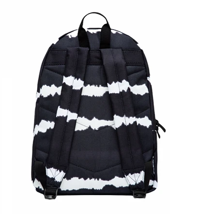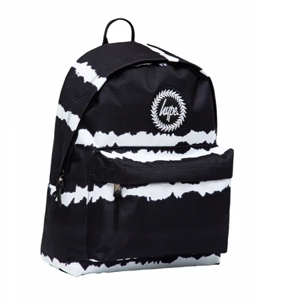 Musta Hype reppu, jossa valkoisia epäsäännöllisiä raitoja. Just Hype reput ovat suosittuja koulureppuja. Reppi on sopivan kokoinen ala-asteikäisille koululaisille. Repussa on hyvät pehmustetut olkaimet ja selkätuki. Repun edessä on vetoketjullinen tasku.