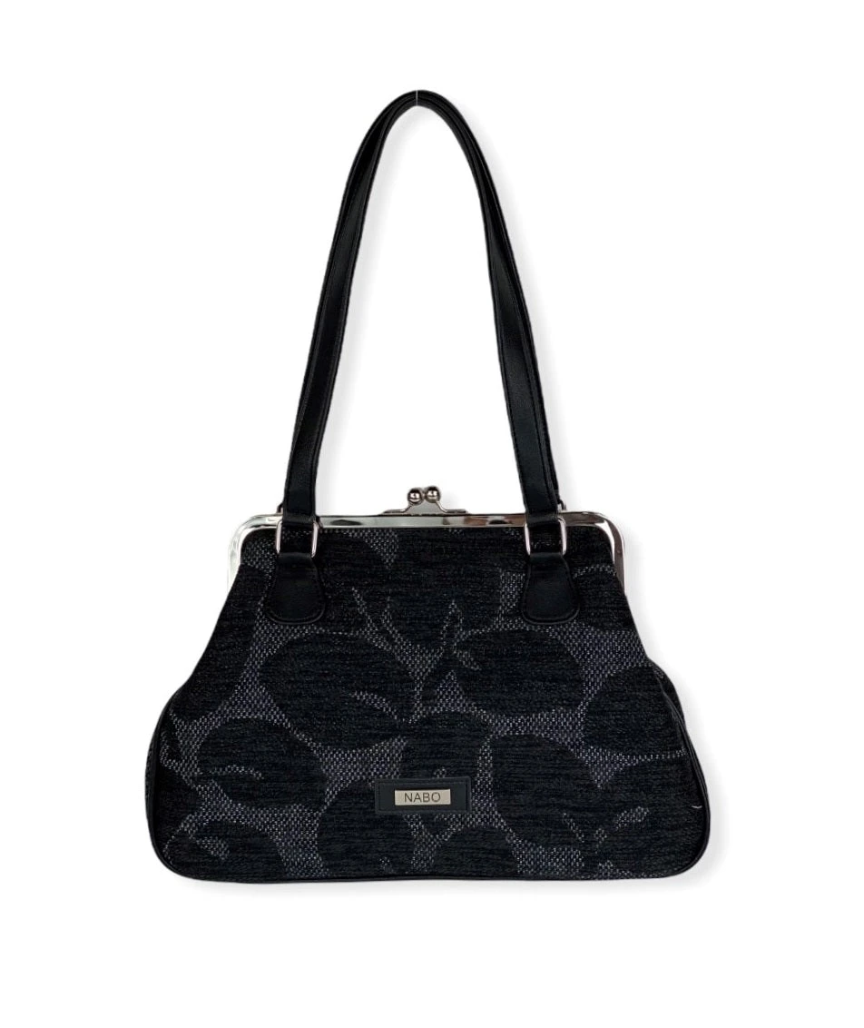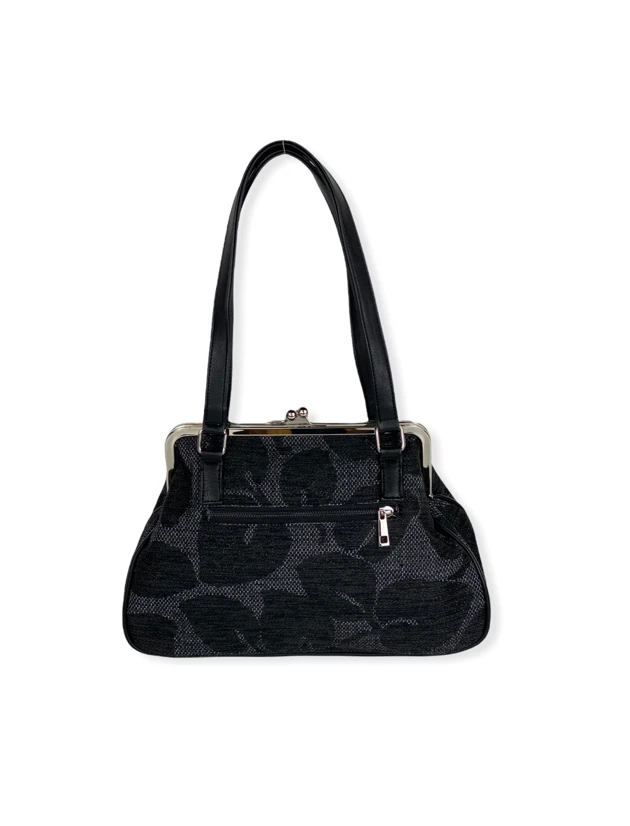 Persoonallinen käsilaukku on valmistettu kotimaassa. Metallikehyskiinnitys henkii menneen ajan tunnelmaa. Laukussa on kaksi puolipitkää kahvaa jotka menevät helposti olkapäälle. Laukun sisällä on kaksi avotaskua ja laukun takana on yksi vetoketjutasku. Kaunis ja hillitty lehtikuosi.