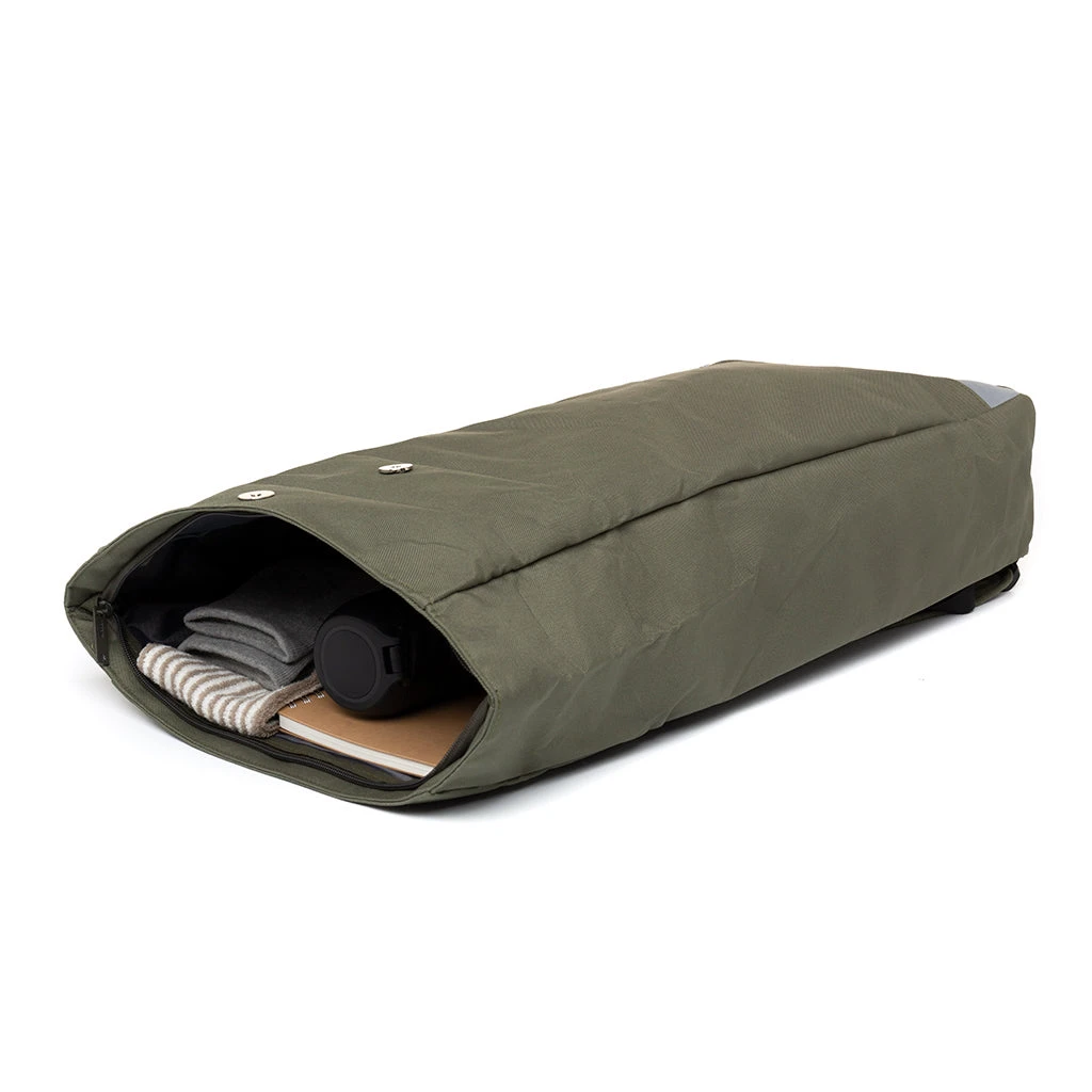 Ekologisen ja turvallisen ei tarvitse olla vastakohta tyylikkäälle ja urbaanille! Roll reppu on käytännöllinen ja vedenpitävä. Repun etupuolella on heijastinnauha ja pieni vetoketjutasku. Repun materiaalien valmistuksessa on käytetty 40 muovipulloa. Lisäksi itse valmistusprosessissa on kuormitettu luontoa tavallista vähemmän. Suuaukossa on vetoketju, ja yläosa taitetaan joko pienemmäksi tai suuremmaksi – tilan tarpeesta riippuen. Taite pysyy paikallaan magneettien avulla. Repussa on pehmustettu läppäritasku, jonne mahtuu max 15″ läppäri. Lisäksi repun sisällä on pieni vetoketjutasku ja muutama avotasku. Repun selkäpuolella on pieni vetoketjutasku arvotavaroille. Repussa on säädettävät ja pehmustetut olkaimet.