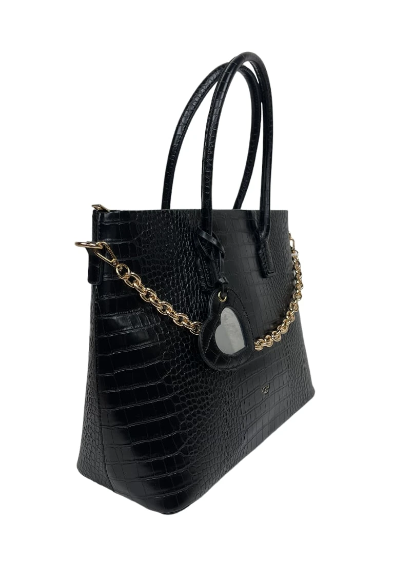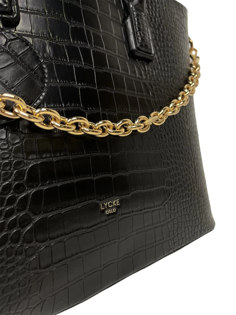 Lycke Oslo Tote on suuri krokokuvioinen laukku, joka toimii mainiosti esimerkiksi työlaukkuna. Katseenvangitsijana toimii krokokuvioinnin lisäksi kultainen ketju jonka saa halutessaan irroitettua. Laukussa roikkuu myös sydämenmuotoinen peili.