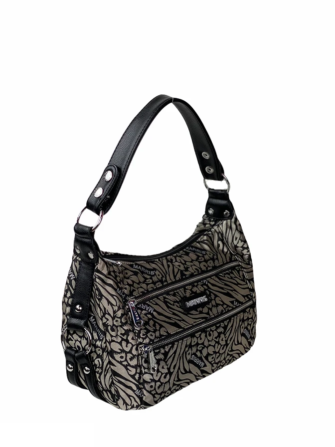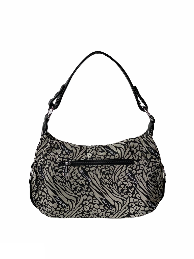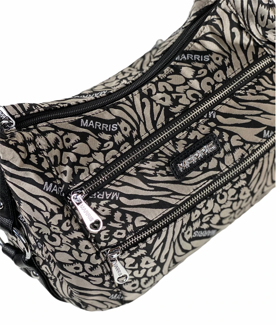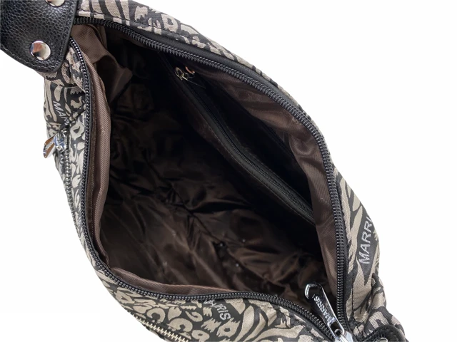 Olkalaukku jossa on kaksi hihnavaihtoehtoa: lyhyt nahkajäljitelmäinen tai pitkä säädettävä kankainen hihha. Voit käyttää laukkua jommalla kummalla tai niin että molemmat ovat laukussa koko ajan. Laukun sisällä on 2 vetoketjutaskua ja kaksi avotaskua. Laukun ulkopuolella on lisäksi molemmilla puolilla vetoketjutaskut.
