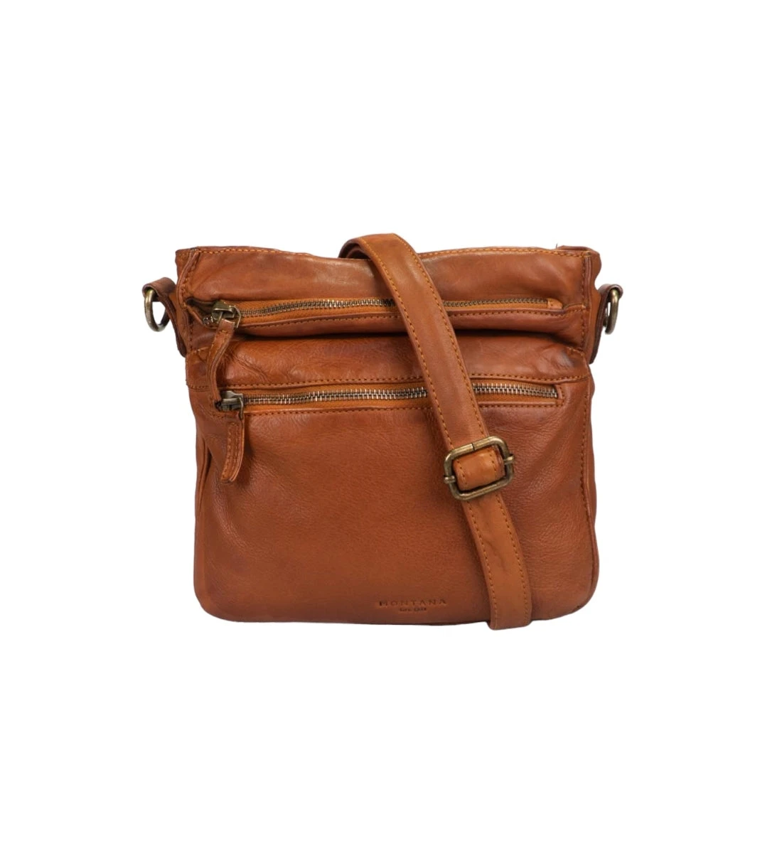 Montanan konjakinruskea olkalaukku on aitoa nahkaa. Laukussa on säädettävä ja irroitettava olkahihna. Laukun etupuolella on yksityiskohtina kaksi vetoketjutaskua, ja lisäksi sisällä vetoketjutasku ja avotasku.