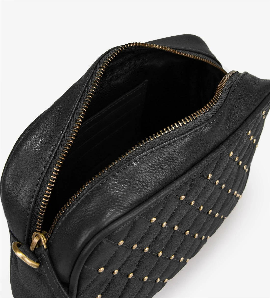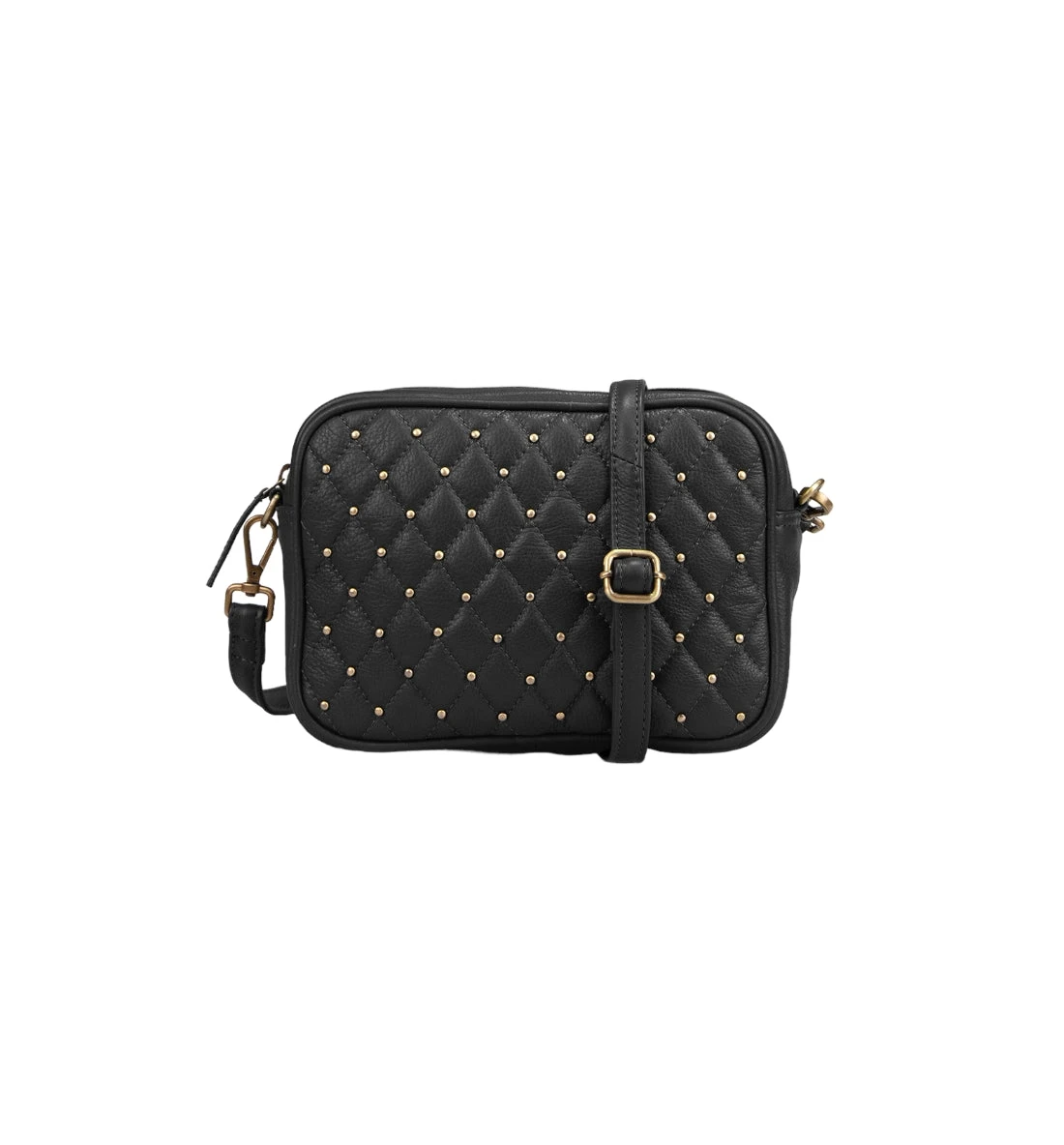 Kauniisti kuvioitu ja niiteillä koristeltu nahkainen tilava olkalaukku. Olkalaukun sisältä löytyy vetoketjutasku, kolme korttitaskua sekä pieni avotasku. Olkahihna on säädettävä ja irroitettava.
