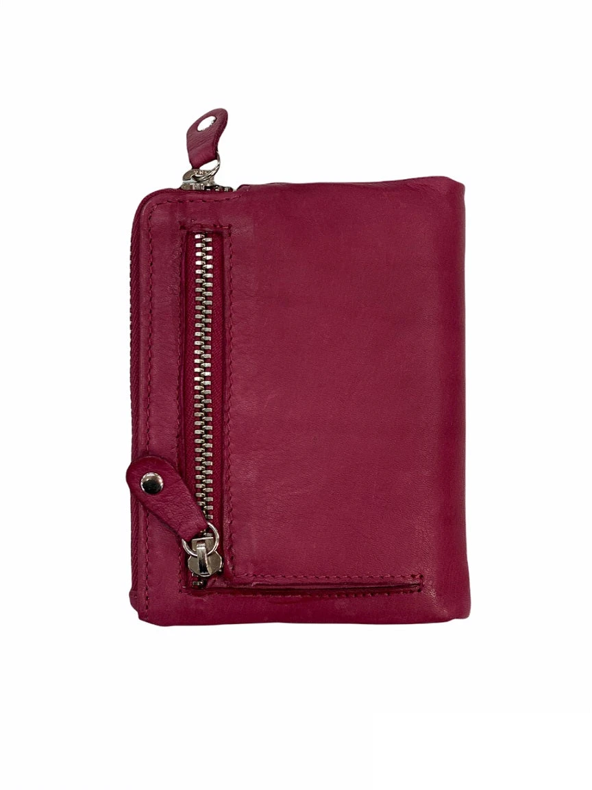 Nabo pieni lompakko on aitoa ihanan pehmeää nahkaa ja siinä on kaunis fuksianpunainen väri. Lompakko aukeaa keskeltä, ja sieltä löytyy tilaa korteille ja seteleille. Lompakon toisella puolella on kaksi vetoketjullista taskua. Lompakko on RFID suojattu.