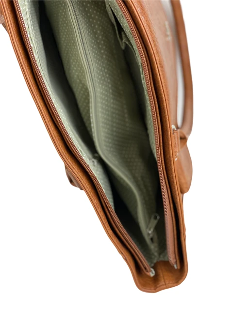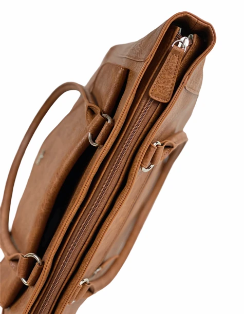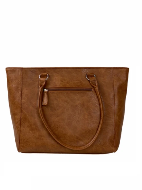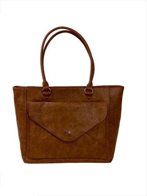 Tässä sopivan kokoinen ja käytännöllinen laukku, joka sopii hyvin vaikka työlaukuksi! Malli on Suomessa suunniteltu. Laukussa on trendikäs konjakinruskea väri, ja se menee hyvin olkapäälle pitkistä käsikahvoista. Laukku pysyy hyvin ryhdissä tyhjänäkin. Laukun sisäosa on jaettu kahtia vetoketjullisella välitaskulla. Lisäksi sisällä on vetoketjutasku ja avotasku. Ulkopuolella on takana vetoketjutasku, ja edessä avotasku sekä nepparilla suljettava tasku, joka toimii samalla hauskana yksityiskohtana.