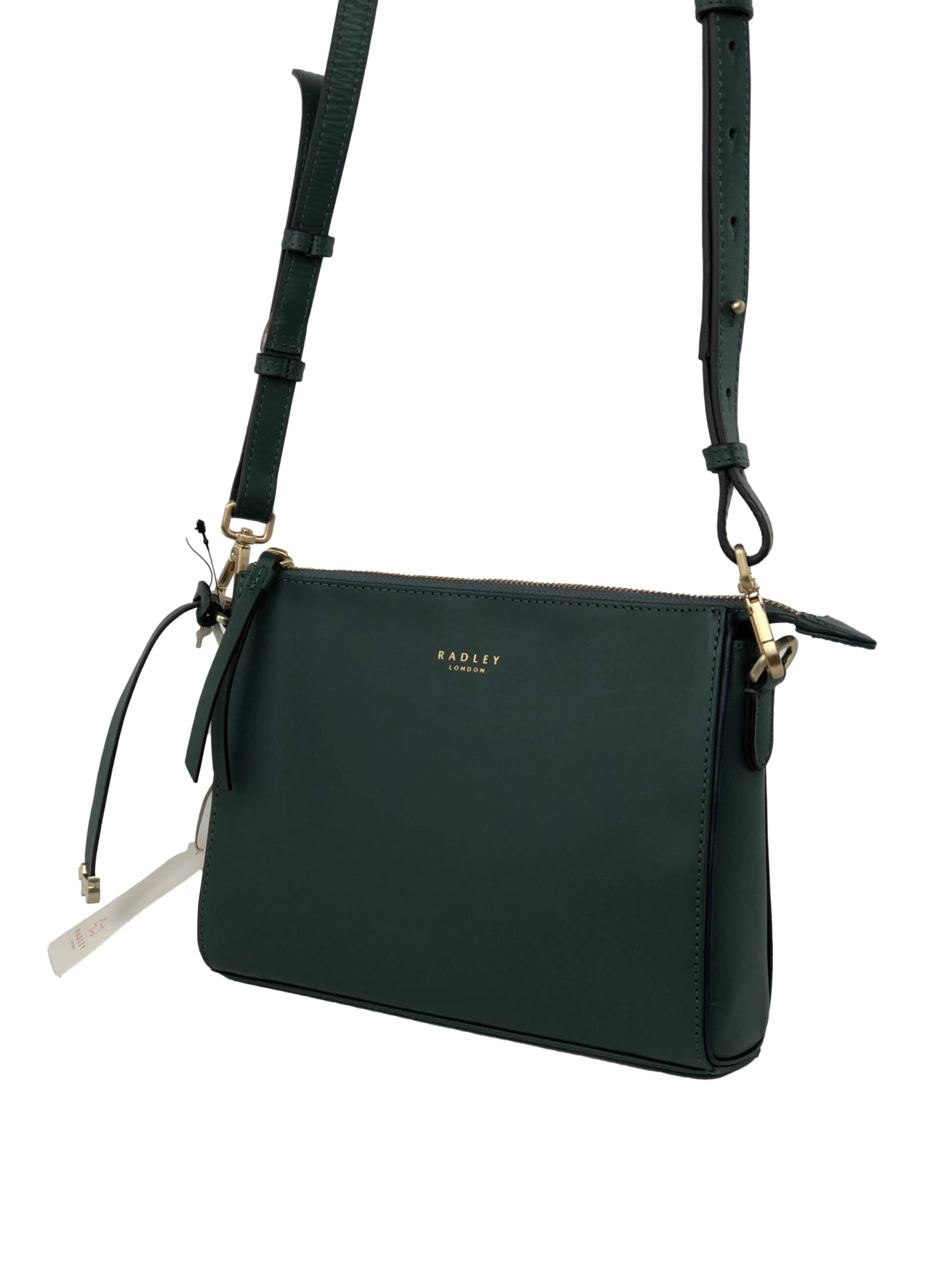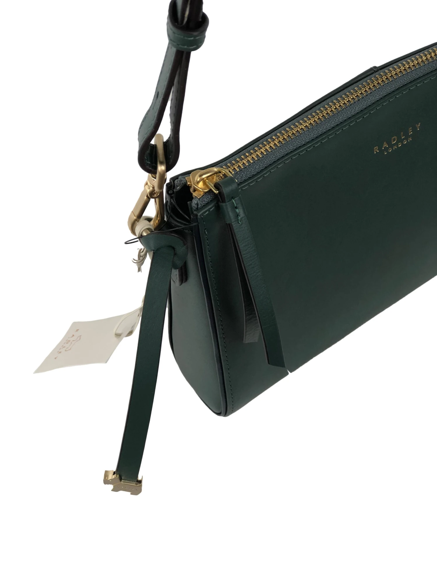 Radleyn pienen olkalaukun nahka on napakka Laukussa on pitkä vähän säädettävä olkahihna. Vetoketjulla suljettavan laukun sisältä löytyy vetoketjutasku ja avotasku. Myös laukun takana on pieni avotasku.