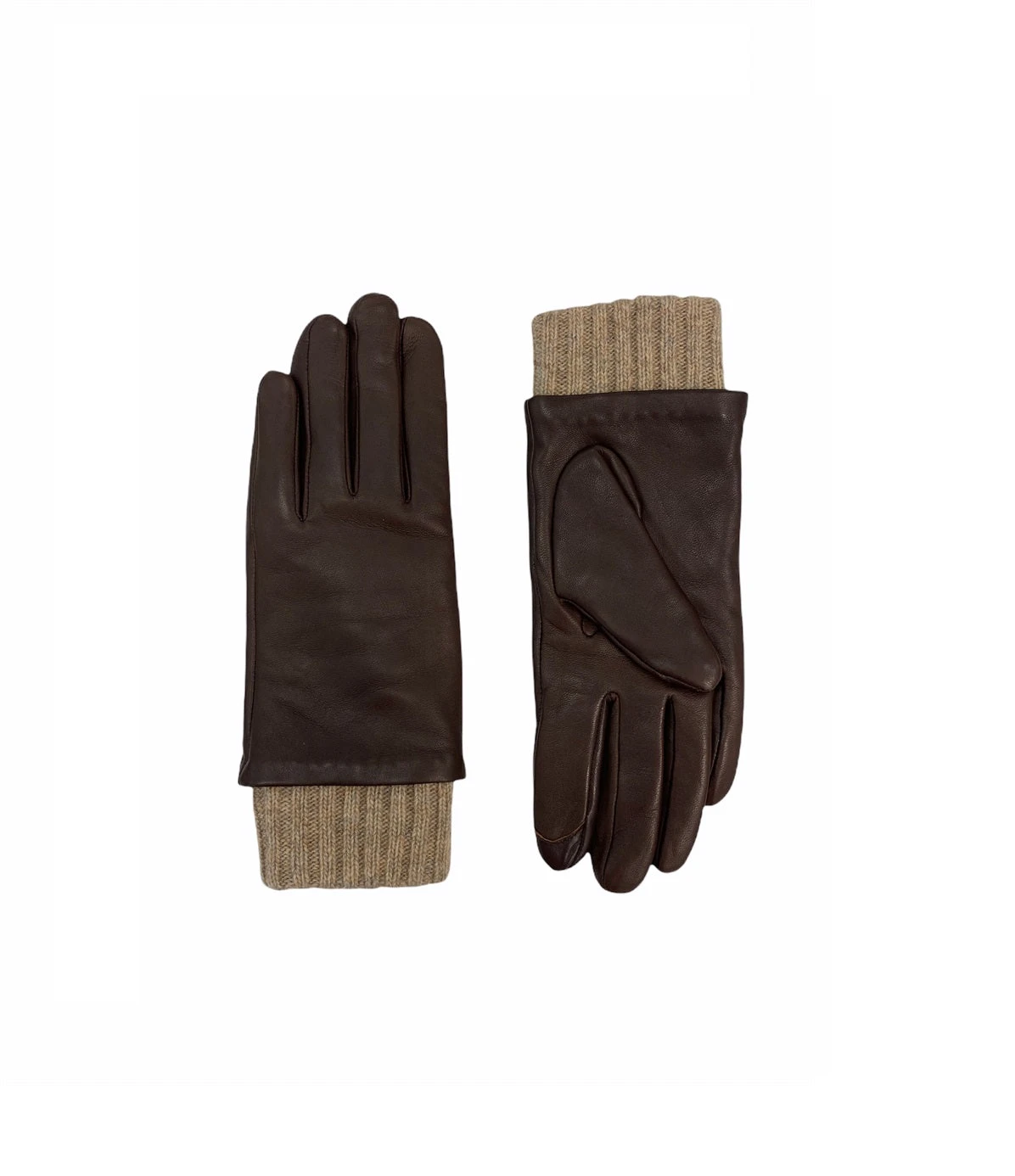 Kauniit naisten villavuoriset nahkahanskat ihanan tummanruskean sävyssä. Resori ja vuori ovat vaaleanruskeat.