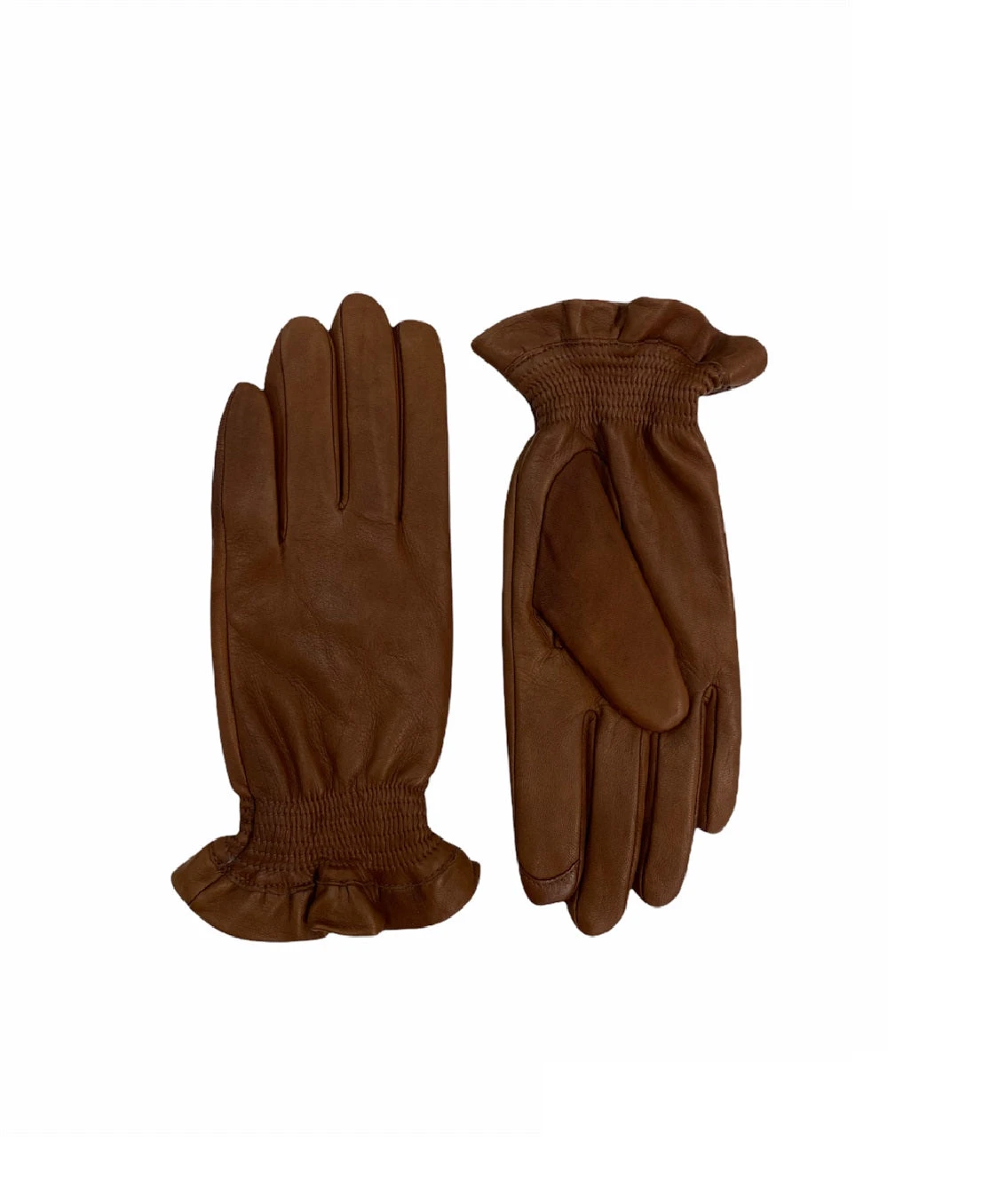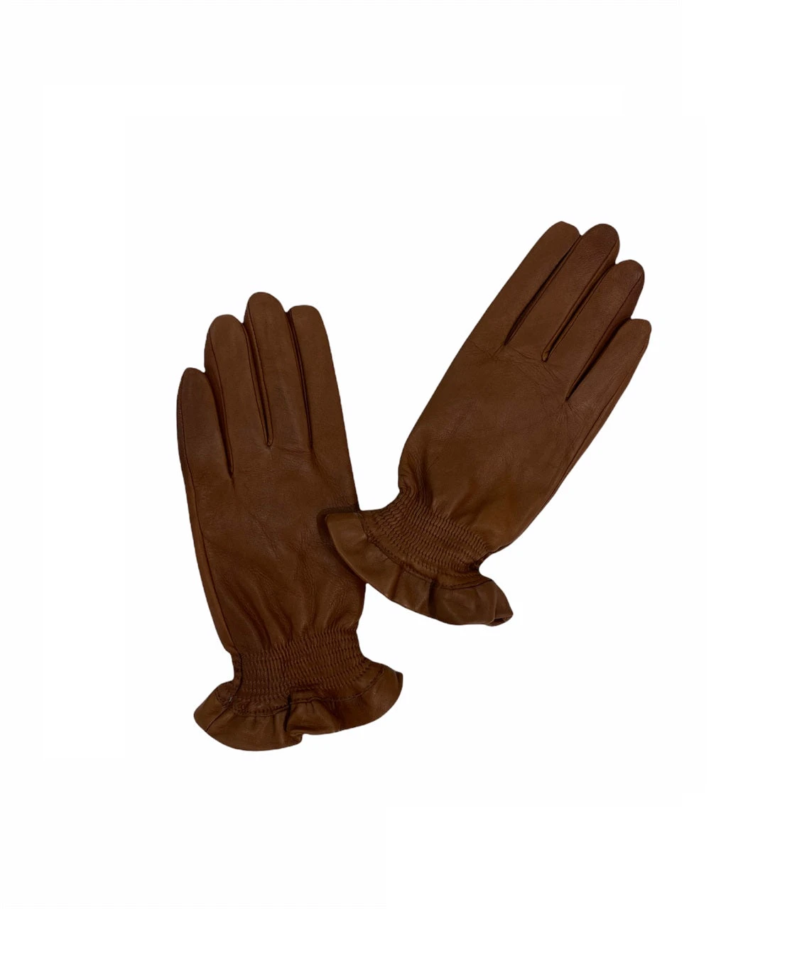 Kauniit naiselliset ja lämpimät naisten nahkahanskat. Yläosassa resori ja naisellinen ”röyhelö”.