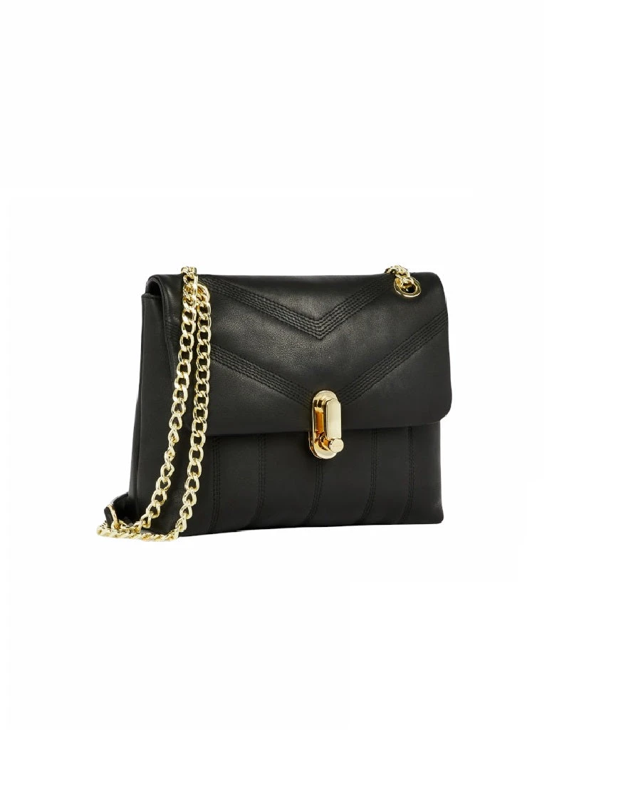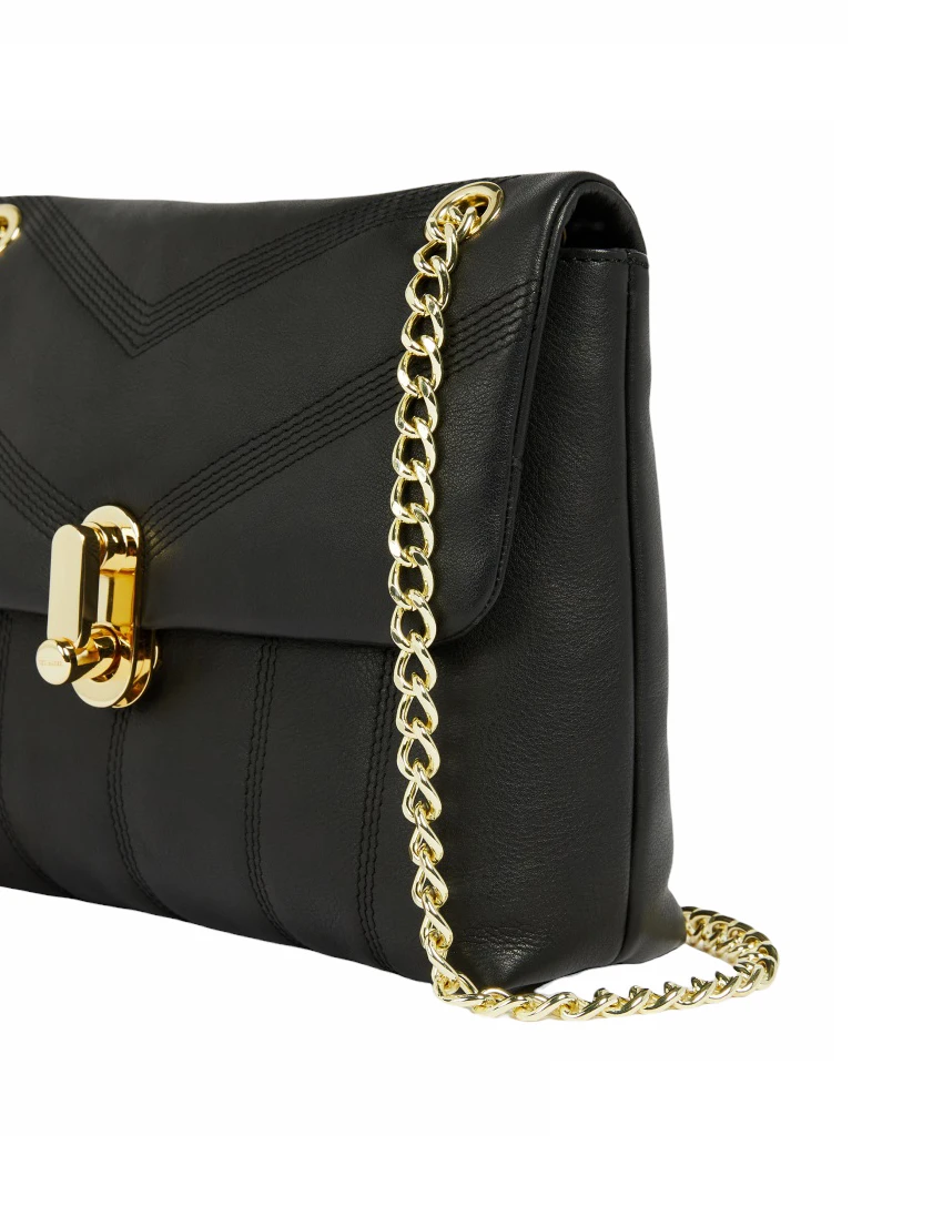 Ted Baker Ayalina on trendikäs puffermainen nahkalaukku. Laukun nahka on miellyttävän pehmeää. Laukku sopii hyvin myös juhlaan, sillä siinä on ketjuhihna. Hihnan voi pitää kaksinkerroin tai yksinkerroin. Hihnassa on olkapään kohdalla nahkavahvike. Laukku suljetaan lukolla, ja läpän alla on avonainen osio, jossa on pieni vetoketjutasku.