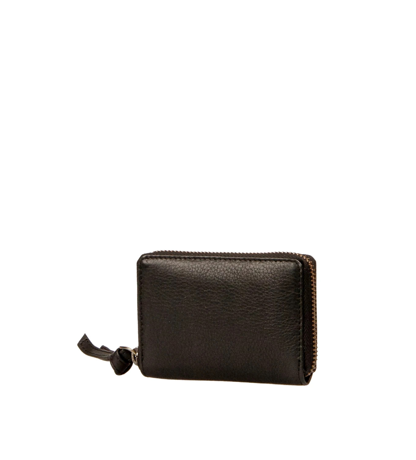 Pieni nahkalompakko jossa keskellä vetoketjullinen pieni kolikkotasku. Sen molemmin puolin on tilaa korteille ja muulle. Lisäksi lompakossa on molemmilla sivuilla 2 korttipaikkaa.