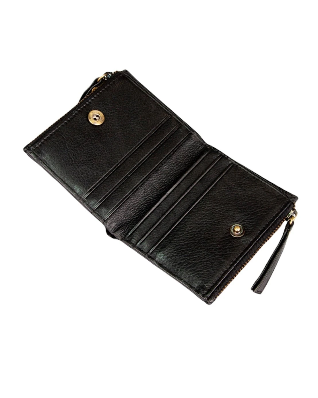 Pieni nahkainen korttilompakko aukeaa keskeltä. Sen molemmin puolin on vetoketjulliset taskut.