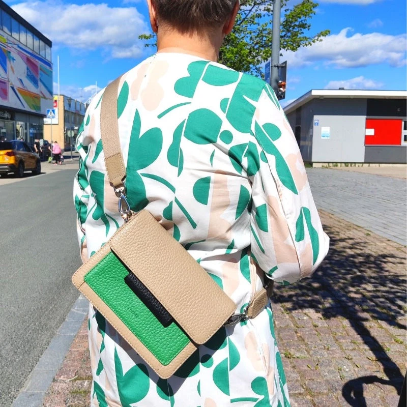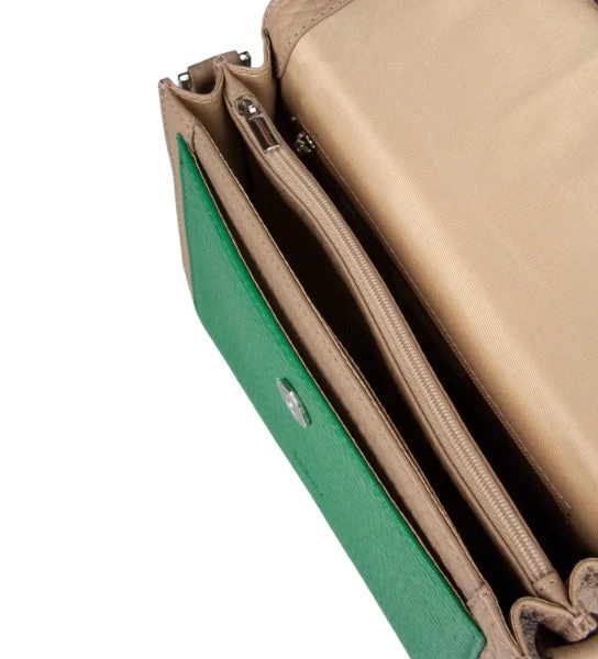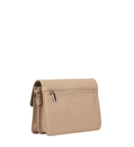 Nelly bae latte on tyylikäs laukku upealla nahkaisella pintakuviolla. Laukku on jaettu kahteen osaan, tilanjakajana toimii vetoketjullinen tilava tasku.. Ensimmäisessä osassa on tilava avotasku jonne menee hyvin esimerkiksi puhelin. Toisessa osiossa on vetoketjullinen tasku. Laukun edessä läpän alla on avotasku, sekä laukun takana on tasku joka sulkeutuu vetoketjulla. Laukun hihna on säädettävä ja irroitettava.
