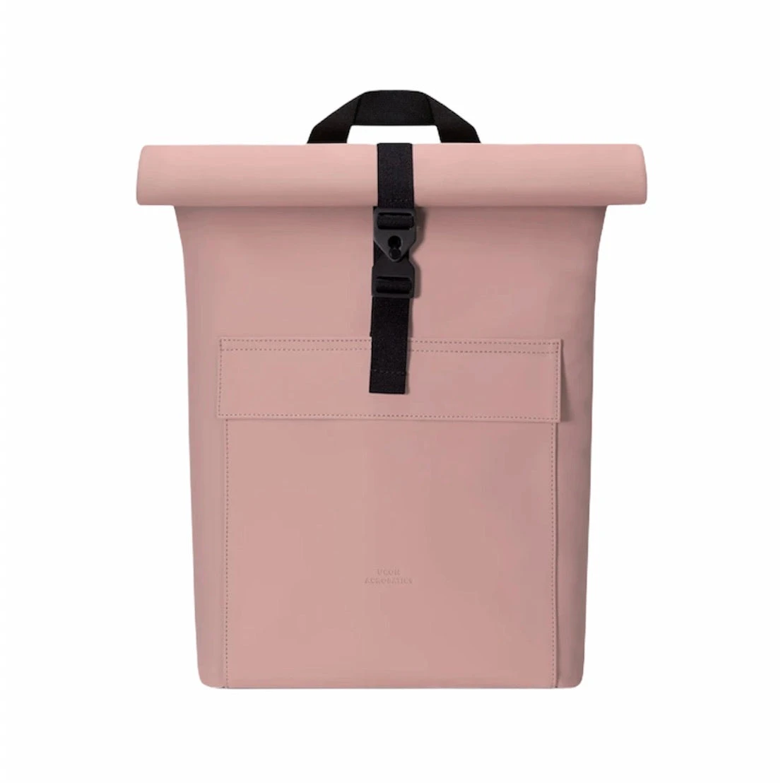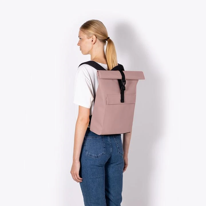 Minimalistinen ja hempeän roosan sävyinen reppu on valmistettu täysin vedenpitävästä materiaalista. Yläosasta rullaamalla saat tarvittaessa 4 litraa lisätilaa reppuun. Repun sivulla on huomaamaton vetoketju, josta pääsee näppärästi käyttämään reppua. Selkäosa ja pohja on tuettu. Olkaimet ovat pehmustetut ja säädettävät. Repun sisällä on läppäritasku max 14″ koneelle ja kaksi avotaskua. Sisällä on elastinen kuminauha johon saa esim. juomapullon. Repun edessä on pieni läpällinen tasku yksityiskohtana, jossa on tarrakiinnitys.
